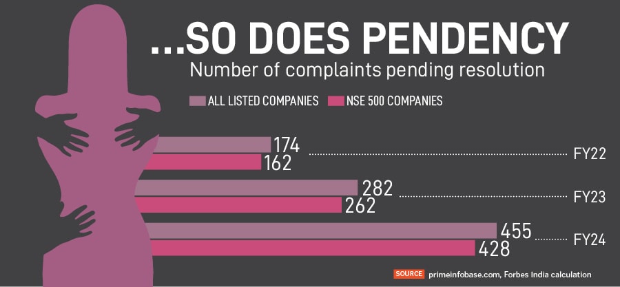 However, there is also a mounting backlog of unresolved cases. The number of pending complaints at all listed companies nearly tripled over the three-year period, jumping from 174 in FY22 to 455 in FY24. For the NSE 500 companies, the pendency rose from 162 to 428 in the same period.
