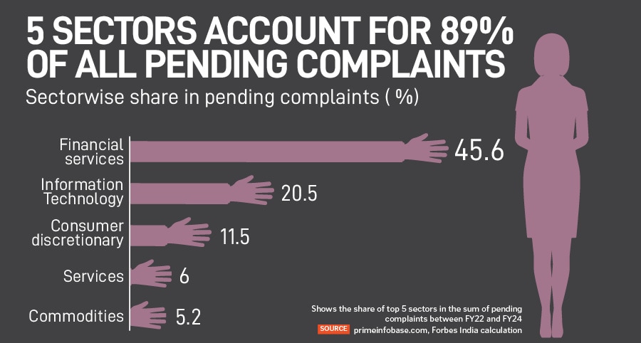 The data reveals that just five industries account for a staggering 89 percent of all unresolved cases between FY22 and FY24. The financial services sector leads the list with nearly 46 percent of the pendency, followed by information technology (IT) at 20.5 percent. The remaining significant contributors are companies from the consumer discretionary, services, and commodities sectors. About 36 percent of all complaints filed are from the financial services sector and another 21 percent from the IT sector.