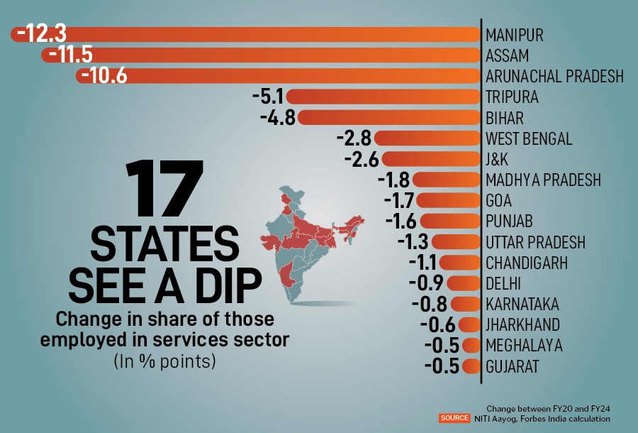But this trend is not confined to smaller economies only. Several populous states have also registered a downturn. Bihar (-4.8 points to 22 percent in FY24), West Bengal (-2.8 points from 36.2 percent in FY20), and Uttar Pradesh (-1.3 points from 24 percent) all saw their service sector employment share shrink, potentially indicating a larger movement of the workforce back towards agriculture, or a struggle to create service jobs for their large populations. Even traditionally strong economic hubs like Delhi and Karnataka recorded marginal dips.