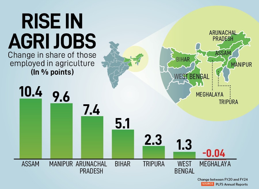 The most notable contractions were observed across the north-eastern states. Manipur saw the steepest drop, with the share of service sector employment falling by 12.3 percentage points from 46.7 percent in FY20 to 34.4 percent in FY24. It was followed closely by Assam (a drop of 11.5 points from 42 percent in FY20), Arunachal Pradesh (10.6 points) and Tripura (5.1 points). This would either suggest a structural pivot or substantial loss of service-related jobs in these regions over the four-year period.