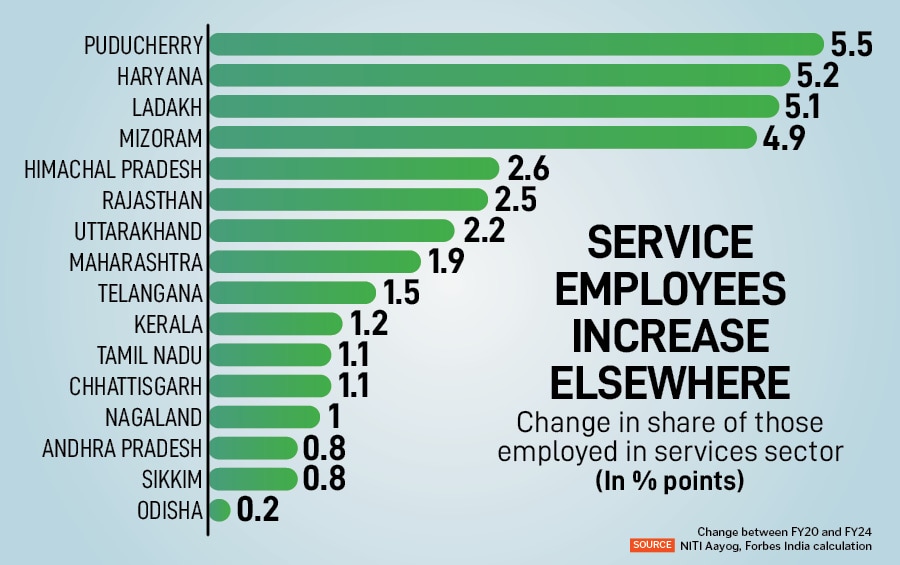 Meanwhile, for 16 states and union territories in contrast, there was an increase in the share of service employees, signifying robust job creation in this domain. Puducherry and Haryana led growth, followed by Ladakh.