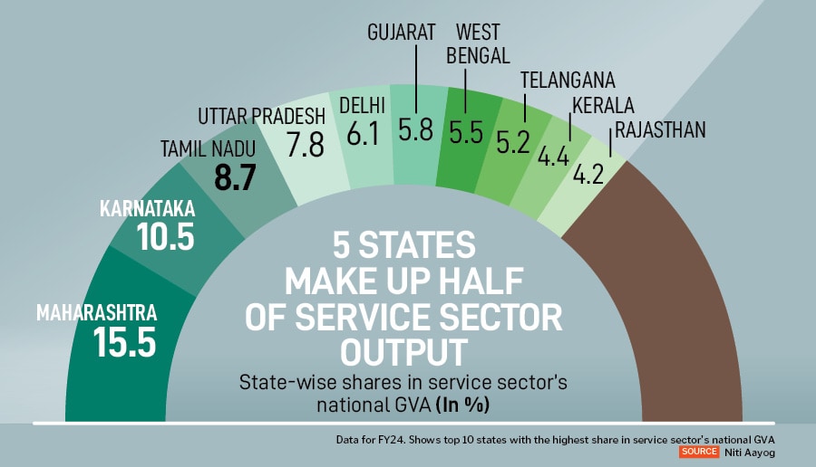 Maharashtra alone contributes a massive 15.5 percent of the country’s service output. Gujarat, West Bengal, Telangana, Kerala and Rajasthan account for another 25 percent.