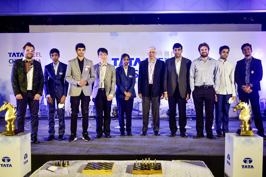 A file photo of the inaugural ceremony of Tata Steel India Rapid and Blitz Chess competition in Kolkata, India in late 2021, showing V Anand, Vidit Gujrathi, R.Praggnanandhaa and Arjun Erigaisi among others. Image: Indranil Aditya/NurPhoto via Getty Images