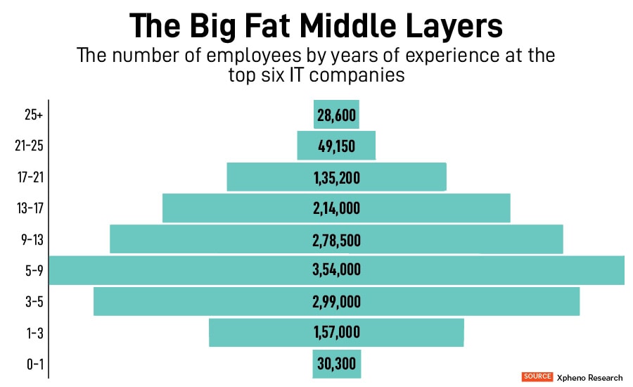 India’s top six bellwether IT companies—TCS, Infosys, Wipro, HCL Tech, Tech Mahindra and LTI Mindtree—employ an estimated 5 lakh people at the mid- to senior-levels. It is this layer that may not be needed.