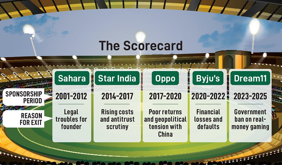 It’s not entirely unusual in global sports for teams to take the field without a lead sponsor. For example, English football club Chelsea has started the current season of the Premier League without a matchday shirt sponsor. But the BCCI title sponsorship, or the lack of it, is complicated by extraneous circumstances. Dream11 is also the fifth in a line of marquee sponsors—after Sahara, Star India, Oppo and Byju’s—to have opted out over issues ranging from financial losses, rising costs or government stance.