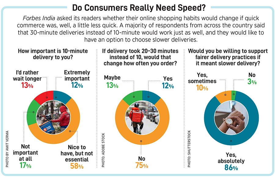 A Forbes India survey asked consumers if they really need 10-minute deliveries: 58 percent of respondents said such deliveries were “nice to have, but not essential”, while 75 percent said they would not change their frequency of orders if deliveries took between 20 and 30 minutes, instead of 10 minutes.