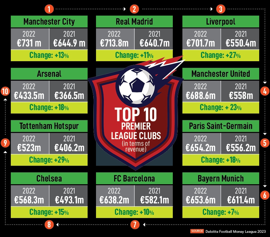 According to Deloitte’s Football Money League report 2023, the total revenue for the top 20 revenue generating clubs in 2021-22 stood at €9.2 billion, an increase of 13 percent compared to the €8.2 billion in 2020-21. Manchester City with a revenue of €731 million, retain their position at the top of the Money League and for the second time were the club to generate the highest revenue in world football.