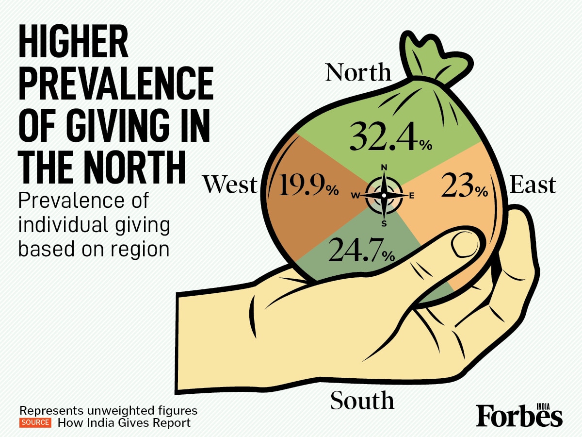 The report highlights a significant geographic and socio-economic divide in how India gives. Regional disparities in giving are sharp. The North leads with a giving prevalence of 32.4 percent, well ahead of the South (24.7 percent), East (23 percent) and West (19.9 percent).