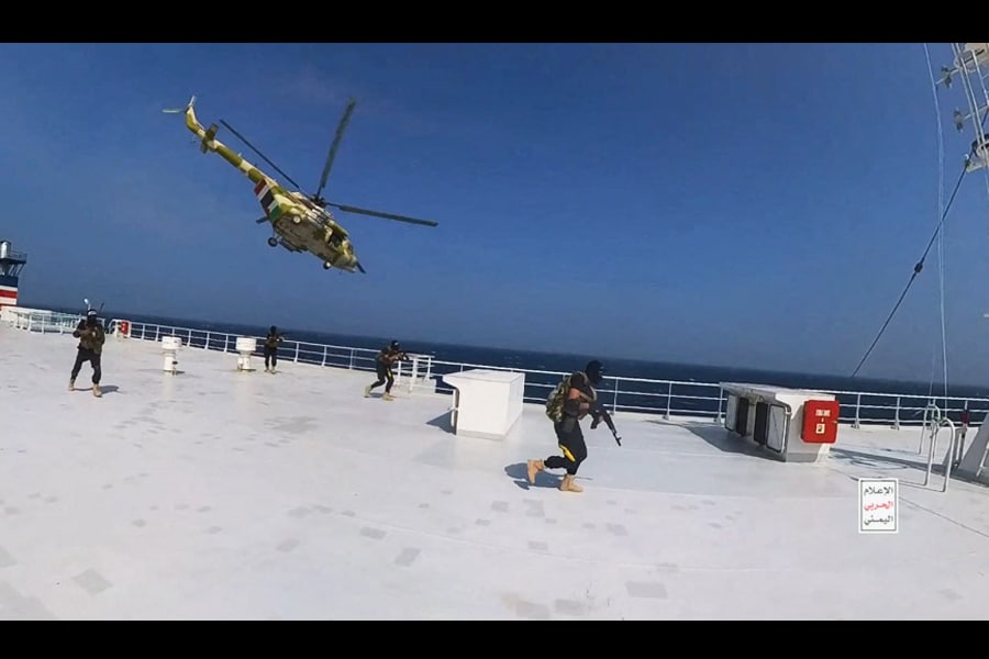 A file photo of Houthi militants" helicopter hovering over the Galaxy Leader cargo ship it seized in the Red Sea on November 20, 2023. Recently, an India-bound Gabon-flagged crude carrier, MV Sai Baba, with 25 Indians onboard, came under a drone attack in the Southern Red Sea. Hours before this attack, a Liberia-flagged chemical tanker MV Chem Pluto, with 21 Indians onboard, was reported on fire after being hit by a rocket "fired from Iran" according to the Pentagon. It was the first time the Pentagon has openly accused Iran of directly targeting ships since the start of Israel"s war on the militant group Hamas, which Tehran backs. Indian Navy sent its guided-missile destroyers to assess the situation and provide assistance.
