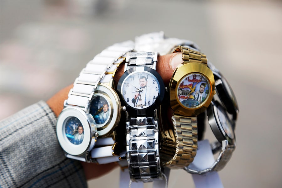 A Yemeni sells watches displaying a portrait of the Houthi leader Abdul Malik Al-Houthi on a street in Sana"a, Yemen, on November 20, 2023. Members of a minority Shia Muslim sect originating from Yemen"s northwestern Saada province, the Houthis take their name from the movement"s founder, Hussein al-Houthi. They emerged as a rebel group fighting the government of Yemeni dictator Ali Abdullah Saleh in the 1990s. The Houthis seized the capital, Sana"a, overthrowing Saleh amidst Arab Spring–linked protests in 2014. The international community do not recognise Houthis as Yemen"s legitimate government.