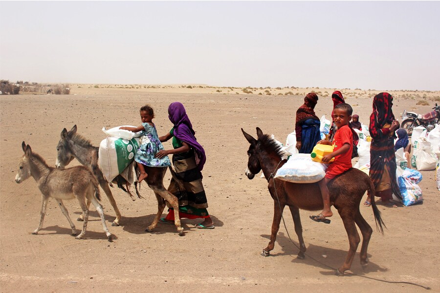 Poor Yemeni families receive flour rations and other basic food supplies from charities in the province of Lahj, in southern Yemen, in early 2022. Since 2014, Yemen, the Arab world"s poorest, has endured a brutal civil war that pits the Houthis against Yemen"s government. A coalition of Arab countries led by Saudi Arabia and UAE and supported by the US backs the government. By the start of 2022, the war had caused an estimated 377,000 deaths—mostly due to malnutrition, unsafe water, and poor medical services, all aggravated by conflict—and displaced four million people, according to the UN, sparking one of the world"s worst humanitarian crises. The violence has subsided since a UN-brokered ceasefire in 2022.