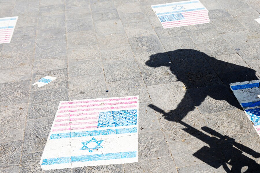 A shadow of a Houthi fighter over trampled-on US and Israeli flags at the tomb of Saleh al-Samad, a Houthi leader, in Sana"a, Yemen, on November 20, 2023. The Houthis - along with Hamas and Hezbollah - declare themselves to be part of the Iran-backed "axis of resistance" against Israel, the US and the wider West. The Houthi rebels are controlled by Lebanon"s Hezbollah group, who have been providing them with extensive military training since 2014, according to a report by the BBC. The substantial funding and weaponry from Iran are helping. Since October, the Houthis have been regularly firing missiles and drones at Israel, a distance of 1,000 miles from Yemen, their longest-range strikes yet. The group"s official slogan: "God is great, death to the US, death to Israel, curse the Jews, and victory for Islam."