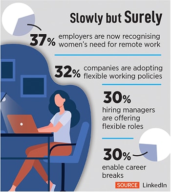 “Our research reveals that due to poor flexi-working policies, India’s working women are 2x more likely to have to choose between childcare and career, when compared to men," Ruchee Anand, senior director-talent and learning solutions, LinkedIn, had told Forbes India in April 2022. Flexible working is the biggest priority for both men and women today, she added, but “the repercussions for not getting flexibility at work are far greater for women in India today".