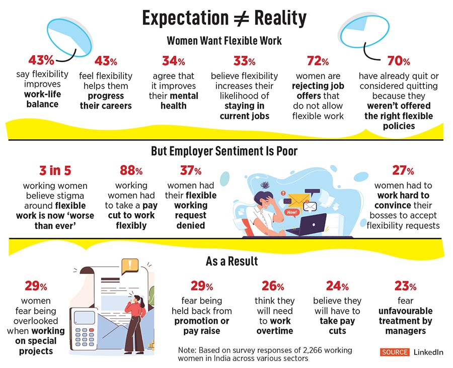 A 2022 consumer research survey conducted by LinkedIn among 2,266 Indian participants found that three in five working women believed the stigma around workplace flexibility is now ‘worse than ever’, with 88 percent women having had to take a pay cut to work flexibly.