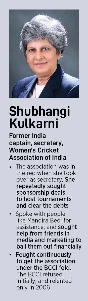 The International Women’s Cricket Council and the ICC were in the process of merging when Kulkarni became WCAI secretary. They mandated that women’s cricket must come under one board. “The BCCI refused… I don’t know why. Right from the beginning, it wasn’t keen on such an arrangement till Sharad Pawar became president,” she lets on. Eventually, women’s cricket came under the BCCI in 2006.
