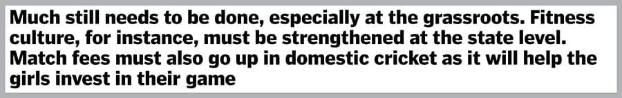 Yet much still needs to be done, especially at the grassroots. Fitness culture, for instance, must be strengthened at the state level, according to the stakeholders. Kulkarni believes match fees must also go up in domestic cricket. “This will help the girls invest in their game,” she says.