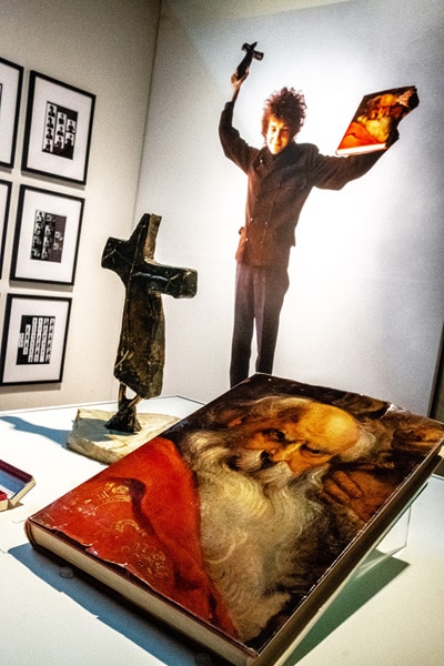 Original props belonging to the photographer Jerry Schatzberg sit before a photograph of Bob Dylan holding them during a photoshoot, at the Bob Dylan Center in Tulsa, Okla., April 30, 2022. A new space to display Dylan’s vast archive, celebrates one of the world’s most elusive creators, and gives visitors a close-up look at notebooks and fan mail. (Joseph Rushmore/The New York Times)