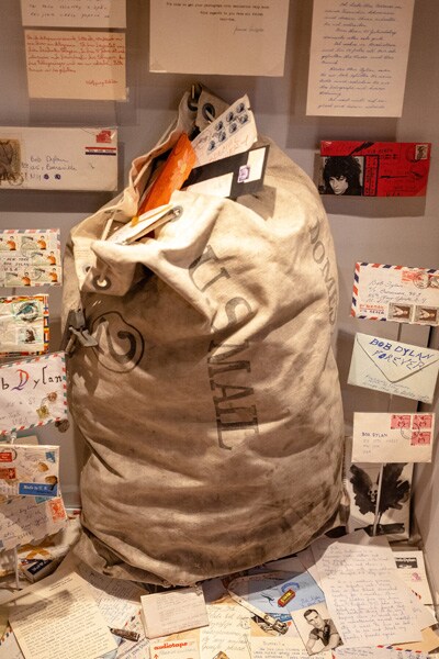 A bag of fan mail directed to Bob Dylan in 1966, on display at the Bob Dylan Center in Tulsa, Okla., April 30, 2022. A new space to display Dylan’s vast archive, celebrates one of the world’s most elusive creators, and gives visitors a close-up look at notebooks and fan mail. (Joseph Rushmore/The New York Times)