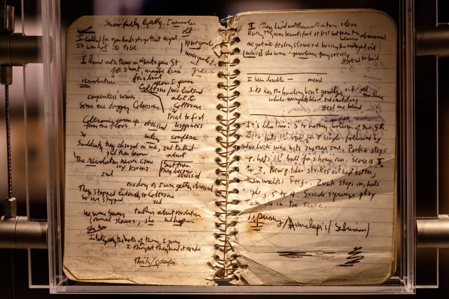 One of three notebooks containing original handwritten lyrics used on the Bob Dylan album “Blood on the Tracks," on display at the Bob Dylan Center in Tulsa, Okla., April 30, 2022. A new space to display Dylan’s vast archive, celebrates one of the world’s most elusive creators, and gives visitors a close-up look at notebooks and fan mail. (Joseph Rushmore/The New York Times)