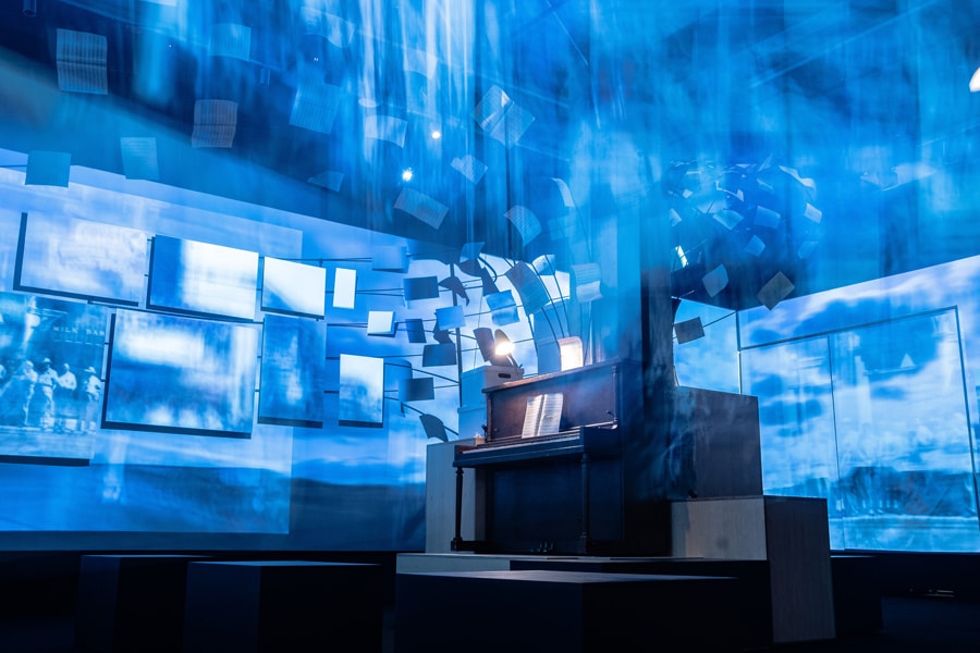 A prop piano that did not belong to Bob Dylan sits in an immersive gallery that nods at how prolific the singer-songwriter has been over his seven-decade career, at the Bob Dylan Center in Tulsa, Okla., April 30, 2022. (Joseph Rushmore/The New York Times)