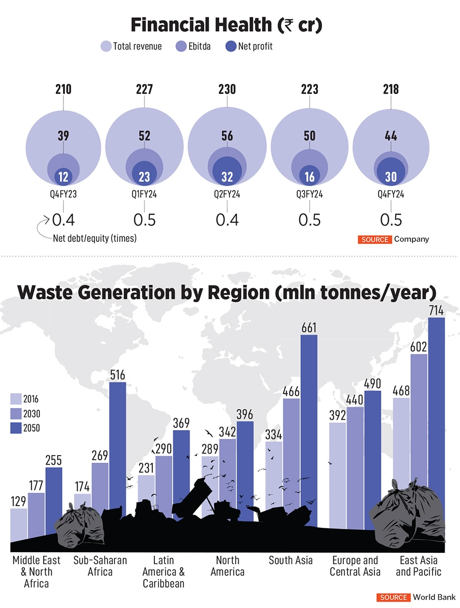 Collection and transportation (C&T), and waste processing are primary segments AWHC operates in. “While C&T generates the majority of revenue, it also requires significant working capital due to operational demands and management of multiple clients. Waste processing, with a smaller client base, has lower working capital requirements," says Subramanian NG, group chief financial officer.
