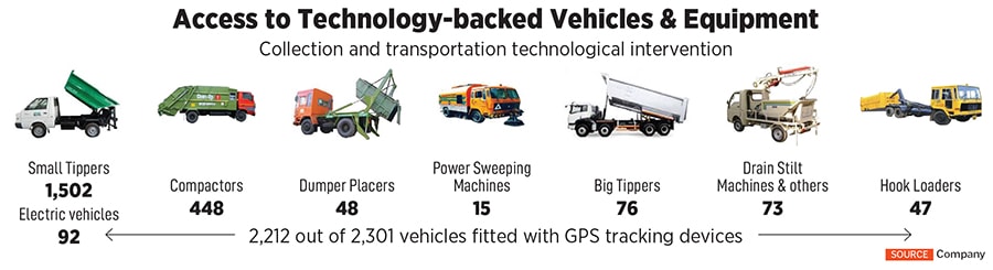 The company’s fleet includes over 2,300 vehicles dedicated to collecting 2.46 million tonnes of waste annually. Of these, 2,200 vehicles are equipped with GPS technology, enabling real-time tracking and operational efficiency. “This allows for immediate responses to waste disposal alerts and optimises route planning," says Shiju.