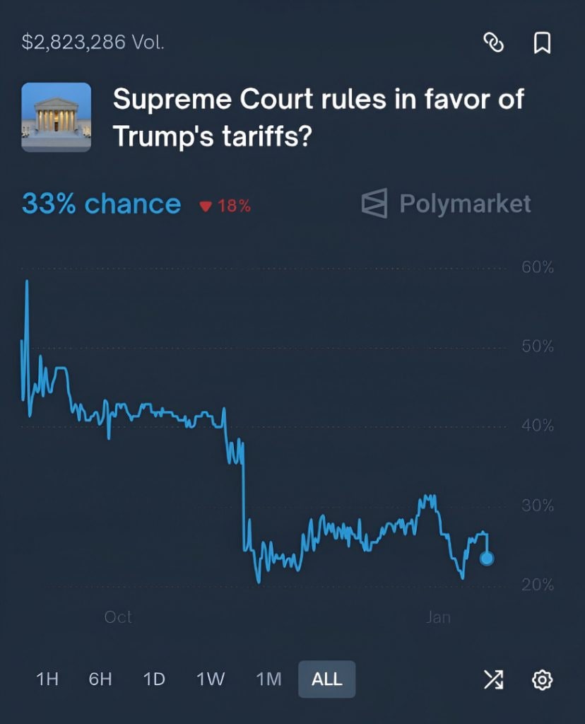 Prediction market Polymarket’s odds of the US Supreme Court ruling in favour of President Donald Trump’s tariffs briefly rose to 33% after the court did not issue a decision today.