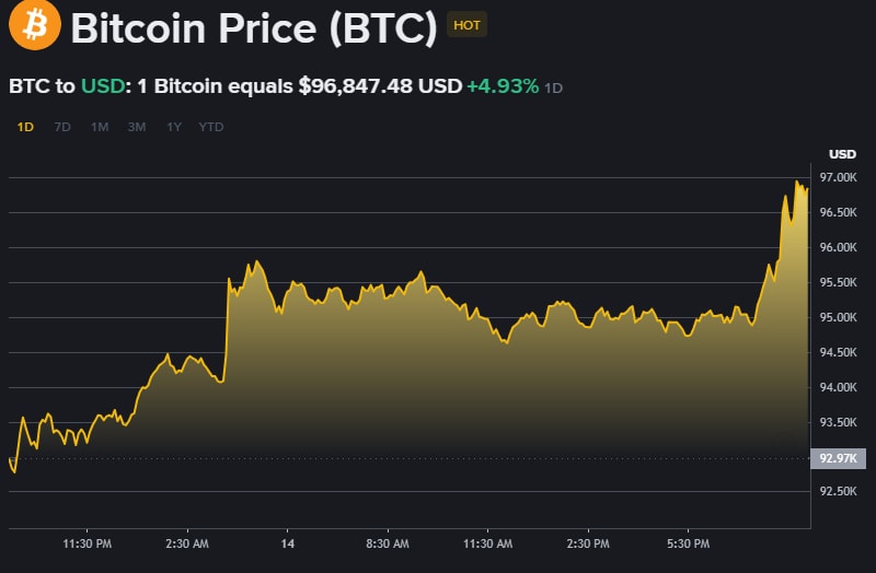 Bitcoin hit $96,946 at 8:45 pm (IST) as markets digested the US Supreme Court’s silence on IEEPA tariffs. With the Court withholding its opinion again, BTC surged more than $1,328 in 45 minutes, rising from $95,617.63 at 8:00 pm (IST), as traders reacted to the extended trade policy limbo.