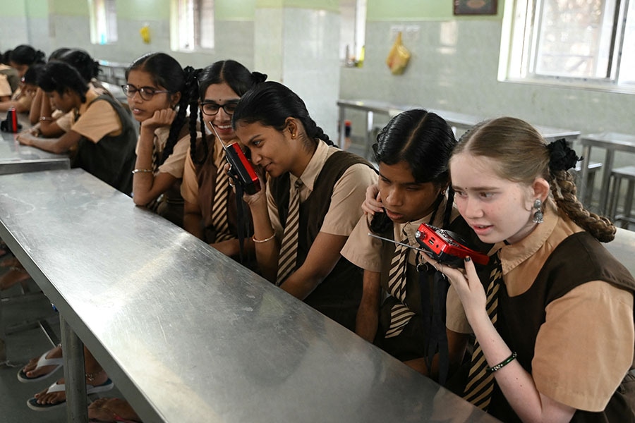 Visually impaired students listen to live radio commentary of the 2023 ICC Men’s Cricket World Cup one-day international match between India and New Zealand at Devnar Residential School for the Blind in Hyderabad on November 15, 2023.