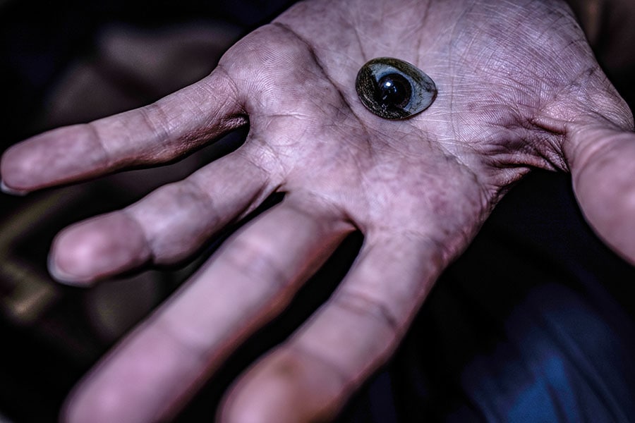 Ahmed Hamid from Nour, Syria, holds a glass eye that was inserted in place of his left eye, after he lost his sight completely in the aftermath of a missile attack by the Syrian regime, August 09, 2023. Each of the 100 families in the village of Nour has at least one person who is visually impaired since birth or has been blinded by the war