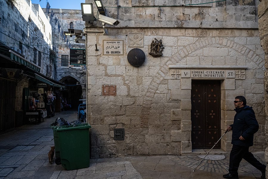 A blind man walks past a Station of the Cross on the Via Dolorosa—the legendary path that Jesus took through Jerusalem to his crucifixion—in the Old City of Jerusalem, Israel, on December 2, 2023. An ongoing Israeli offensive, in retaliation against an attack by Hamas militants on October 7, has killed over 22,000 Palestinians thus far.