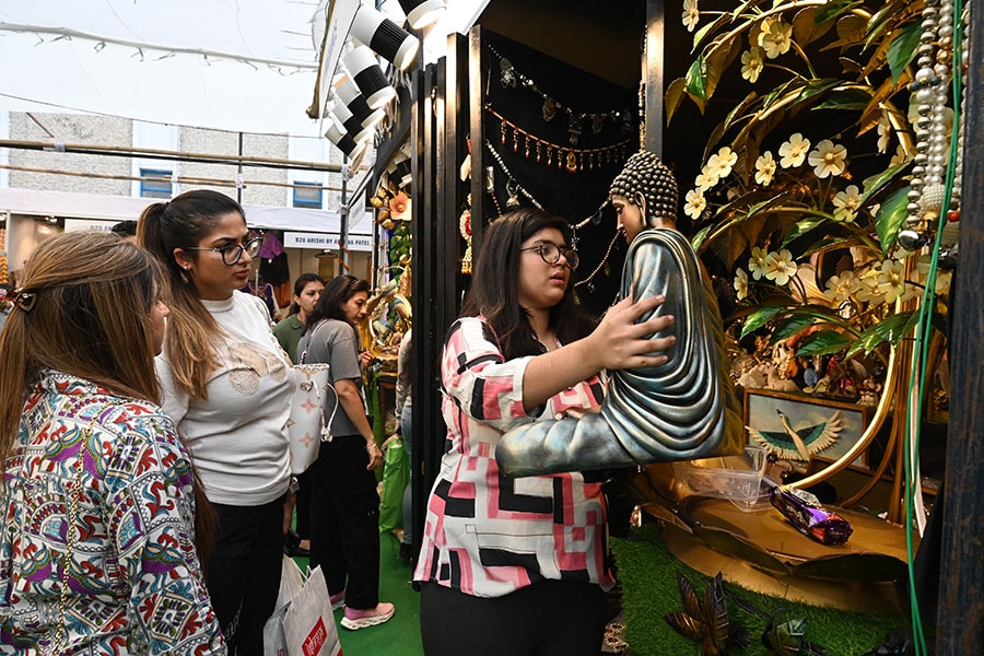 A statue of Buddha, his almost-closed eyes representing focused concentration, attracts a shopper at Diwali bazaar organised by the Blind Relief Association at Lodhi Road on November 7, 2023 in New Delhi, India. An annual event for 42 years now, the bazaar showcases the products made by the visually impaired trainees and workers of the Association. The earnings help finance their diverse services.