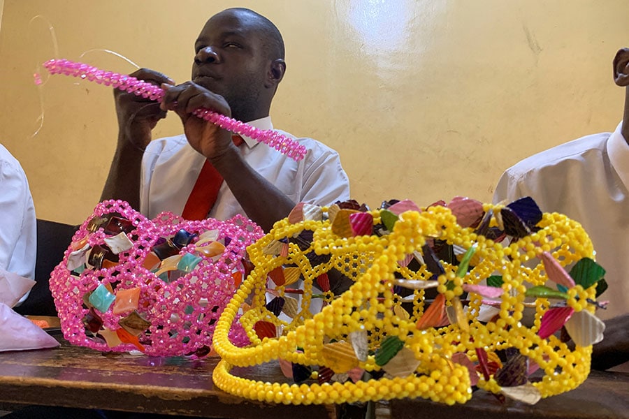Aloga Friday, a visually impaired person, makes beads bags after Sunday church service at Bethesda Home for the Blind in Lagos, Nigeria, on July 2, 2023. "One of the cardinal areas of focus of this 2023-2025 biennium is to reach out to the physically-challenged," the founder of the Home Chioma Ohakwe was quoted as saying