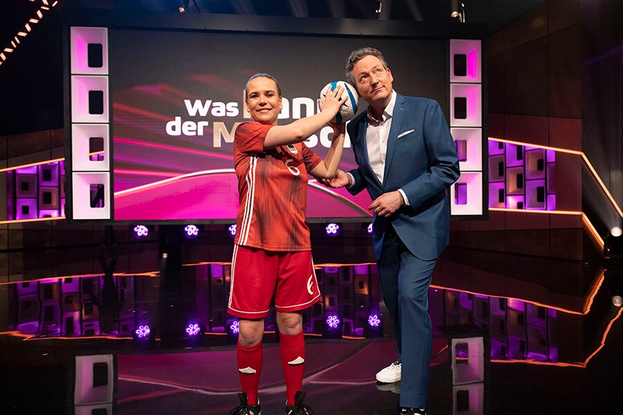 Blind German soccer player Jana Marquart stands with presenter Eckart von Hirschhausen in the TV studio before the recording of the ARD show "Was kann der Mensch" (What Humans can Do) in North Rhine-Westphalia, Cologne, Germany, on April 22, 2023. Jana shakes the soccer ball, which has built-in rattles, as blind soccer players play by the ear. Germany became the first women’s European champion in blind football, defeating England by 4-0 in June 2022