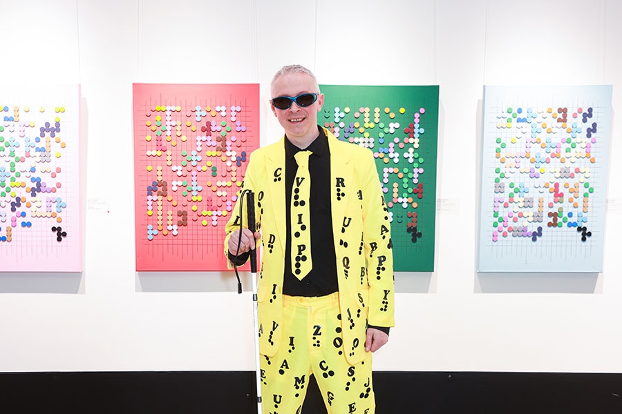 Acclaimed visually impaired artist Clarke Reynolds exhibits his Braille works in "The Power of Touch’, his first London solo exhibition on January 11, 2023. Visitors to the show wore special glasses to sample Clarke’s distinctive braille art in much the same way a blind/partially sighted person would.