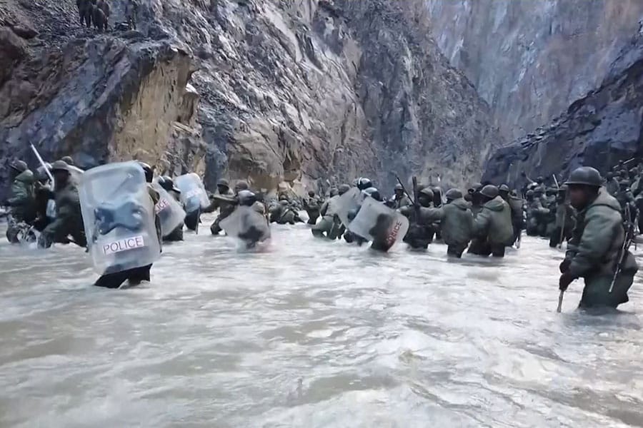 This video frame grab taken from footage recorded in mid-June 2020 shows Indian soldiers crossing a river during an incident where Chinese and Indian troops clashed in the Line of Actual Control (LAC) in the Galwan River valley in the Karakoram Mountains in the Himalayas. There were also reports that in the aftermath of the border clashes, China has blocked the flow of the Galwan River, which crosses from the disputed Chinese-administered Aksai Chin region into the Ladakh region in India. The conflation of the China–India territorial disputes exacerbates water as a source of conflict between them.