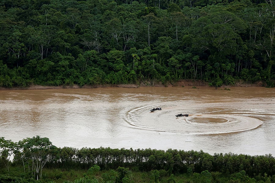 Combined armies of Brazil, Peru and Colombia patrol the Jurua River, a part of the vast Amazonas, to combat illegal logging and drug trafficking at the triple border in Porto Walter, Acre state, Brazil. South America—Brazil, Colombia, Venezuela, Suriname, Guyana, French Guiana, Bolivia, Paraguay, and Uruguay—has the largest proportion of international borders made up of rivers.