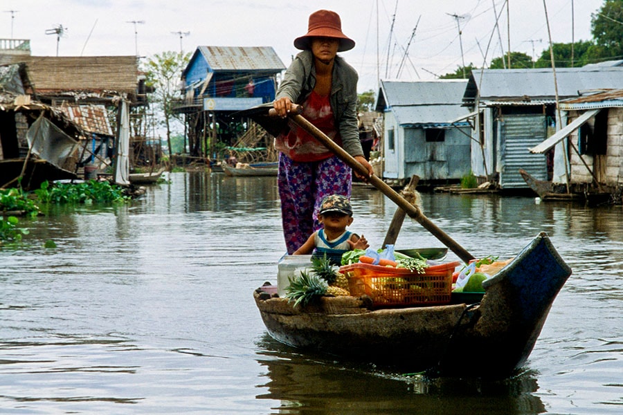 A Cambodian woman ferries goods and her child in Kampong Chhnang. The countries that constitute the Lower Mekong—Cambodia, Laos, Vietnam, and Thailand—have been excellent examples of cooperation in sharing rivers even while they were at war.