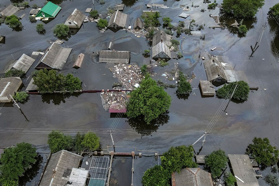 An aerial view shows a flooded area after the Nova Kakhovka dam breached amid Russia"s attack on Ukraine in Kherson, Ukraine, on June 10, 2023. An explosion ripped apart the dam in Ukraine, unleashing floods that killed 58 people, devastated the landscape along the Dnipro River and cut off water to productive farmland. The dam"s destruction was one in a series of attacks on water infrastructure that occurred during the Russia-Ukraine war, which Ukrainian officials and the European Parliament blame on Russia, even though the structure was under Russian control.