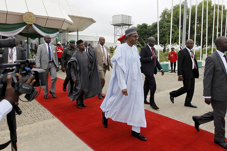 Nigeria"s President Muhammadu Buhari and Vice President Yemi Osinbajo arrive at the Summit of Heads of State and Governments of the Lake Chad Basin Commission (LCBC) in Abuja, Nigeria, in late 2015. Amidst threats from the Islamist militant group Boko Haram, the Commission was able to not only manage shared waters but also promote regional integration, peace, security and development. Chad, Niger, Nigeria, Cameroon, Central African Republic and Algeria share Lake Chad Basin.