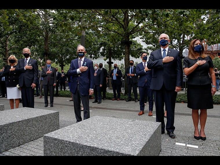 Democratic presidential nominee and former Vice President Joe Biden and his wife Jill, former New York City Mayor Michael Bloomberg, U.S. Vice President Mike Pence and his wife Karen all stand with their hands over their hearts as they attend ceremonies marking the 19th anniversary of the September 11, 2001 attacks on the World Trade Center at the 911 Memorial & Museum in New York City.