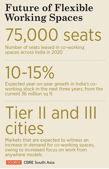 Experts say new ways of working, and a mix of work from office and home are here to stay. Further, flexible working as a concept has been evolving across the globe, and is rapidly gaining acceptance in India by both the employers and the employees. A May 2021 report by CBRE, a commercial real estate services and investment firm, says that while in 2020, 75,000 seats in flexible spaces were leased in India, the country’s flexible space stock could grow 15 percent (year-on-year), from the current 36 million sq ft, over the next three years.