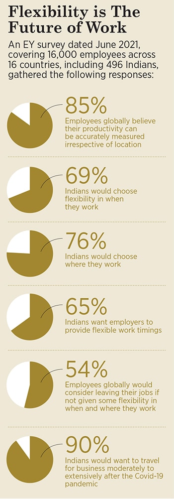 “The Covid-19 pandemic has shown that flexibility can work for both employees and employers, and flexible working is the new currency for attracting and retaining top talent," says Anurag Malik, partner, people advisory services, EY India, a consultancy firm. “Employers who want to keep the best people now and in the next normal will need to put flexible working at the centre of their talent strategy, and accordingly redesign their work models to increase flexibility for their employees."