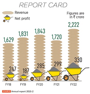 The company indeed has grown at a superfast pace. From a clinker and cement capacity of 0.3 million metric tonnes and 0.4 million metric tonnes, respectively, in FY05, the numbers leapfrogged to 2.8 MTPA (million tonnes per annum) and 5.7 MTPA in FY21. With over 23 percent market share, Star happens to be the biggest cement player in terms of volume and capacity in the Northeast. It has six manufacturing units—four in Meghalaya, and one each in Assam and West Bengal. The scale has been matched by growth of revenue. From ₹1,629 crore in FY18, it has surged to ₹2,222 crore in FY22. Net profit, however, slipped a tad lower from ₹330 crore to ₹247 crore.