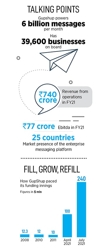 Fast forward to April 2021. Gupshup raises $100 million and enters the unicorn club—privately-held companies with a valuation of $1 billion or more. Three months later, it raises another $240 million and takes its valuation to $1.4 billion. The company now powers over 6 billion messages per month, has posted a revenue of ₹760 crore and an Ebitda of ₹77 crore in FY21. It’s now a profitable unicorn.