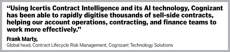 “Using Icertis Contract Intelligence and its AI technology, Cognizant has been able to rapidly digitise thousands of sell-side contracts, helping our account operations, contracting, and finance teams to work more effectively," Frank Marty, global head for contract lifecycle risk management at Cognizant Technology Solutions, one of the world’s biggest IT services companies, said in a press release at the time.