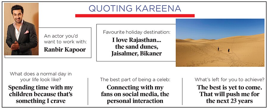 Another role that she has played to perfection is that of a mother to two sons—Taimur and Jehangir (Jeh). Kapoor Khan, who married actor Saif Ali Khan in 2012, admits that her priorities have since changed and she’s clear about them. “Earlier, you are focussed on your career. But I chose that I want to have a life as well… because for me, as a woman, that’s what I wanted. I was sure that I will always work, but I will also go home to my family which is extremely important to me. I balance it, but I have kind of learnt the art to cut off," she says.