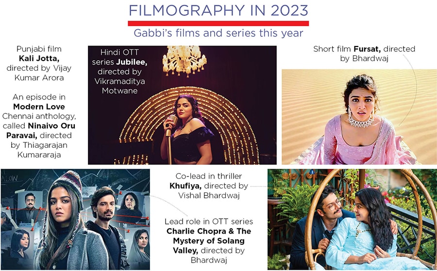 Gabbi followed up Niloufer with the lead role in Vishal Bhardwaj’s series adaptation of Agatha Christie’s The Sittaford Mystery, which was called Charlie Chopra & The Mystery of Solang Valley. She then played co-lead with Tabu in the Netflix film Khufiya, also directed by Bhardwaj. Along the way, she also starred in Thiagarajan Kumararaja’s trippy and meta short film in the Modern Love Chennai anthology, and played one of the leads in Punjabi film Kali Jotta. She was also the protagonist in the short film Fursat, directed by Bhardwaj.