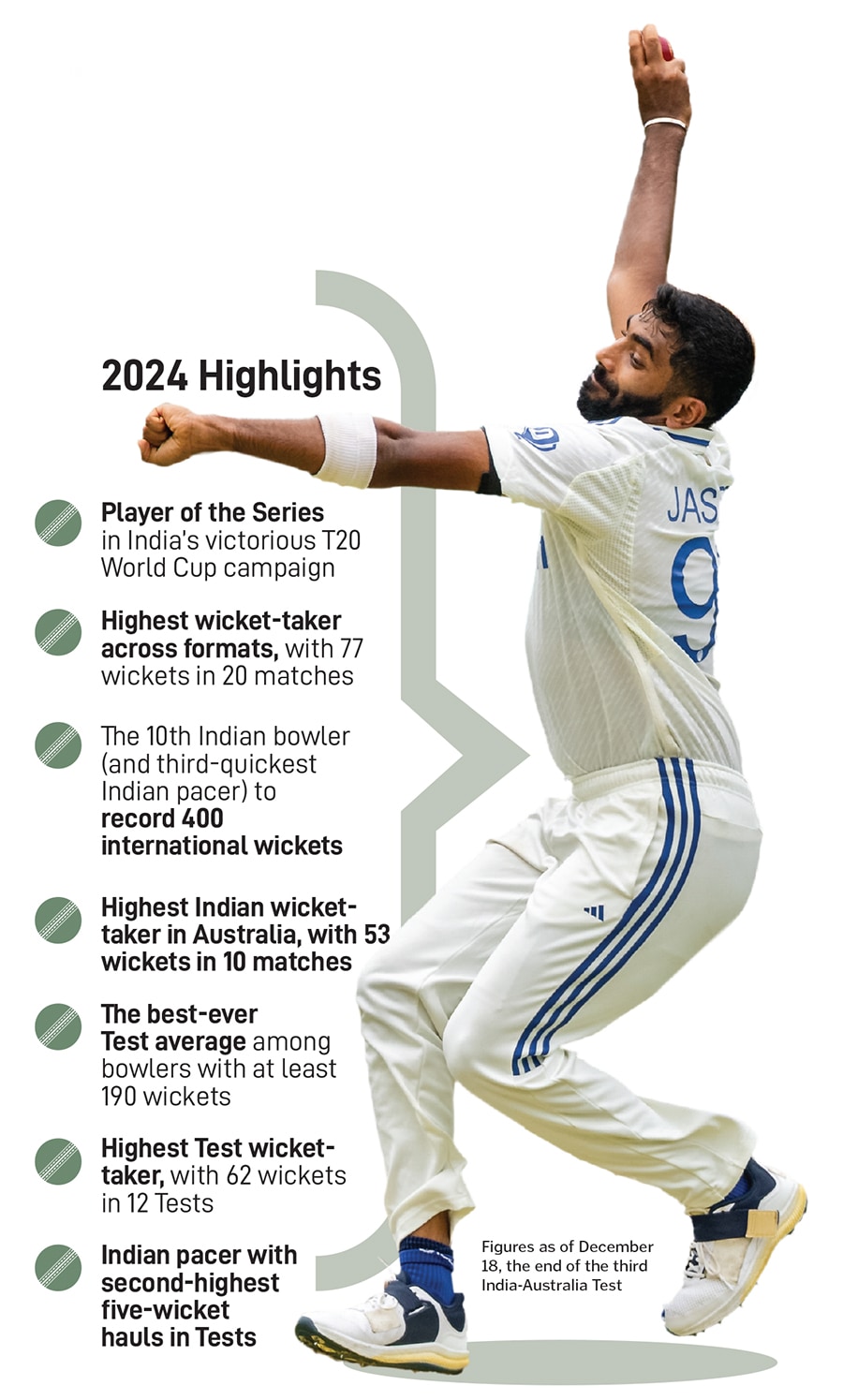 At a time format specialists are on the rise, Bumrah has been able to stamp his authority across formats. 2024 is a case in point: In the year, he won the Player of the Series in India’s victorious T20 World Cup campaign, became the year’s highest wicket-taker with 77 wickets in 20 matches, and was also the most prolific Test bowler with 62 wickets in 12 Tests (as of December 18, till the end of the third Test against Australia).