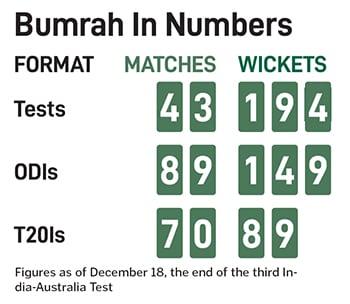 He has been lethal irrespective of conditions—while his overall career average (the number of runs conceded per wicket) is at a measly 20.54, in spin-friendly home conditions it creeps up only just, to 22.76. His Test average, at 19.52, is second only to Englishman Sydney Barnes (among bowlers who have taken at least 150 wickets). But Bumrah, with 194 wickets, has overtaken Barnes in the tally of wickets, which means no other bowler in the history of the game has taken as many wickets at a better average.